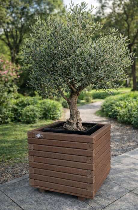 Las jardineras urbanas de Plasticwood están fabricadas con madera plástica obtenida a partir de plástico reciclado, un material técnico ideal para exterior por su resistencia, durabilidad y ausencia de mantenimiento.
